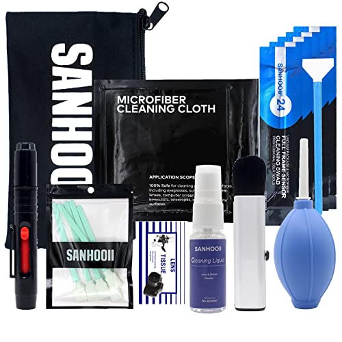 Item include: 1 x 20ml SANHOOII Cleaning Liquid, 1 x Air Blower, 1 x Double Sided Lens Cleaning Pen, 1 x Cleaning Brush, 1 x Microfiber Cleaning Cloth(9in*9in), 5 x Depuration Sponge Swabs, 6 x Full Frame Sensor Cleaning Swabs, 1 x 25 Sheets Camera Cleaning Tissue, 1 x SANHOOII Carrying Bag. Safe for all electronics, coated lenses and sensors.