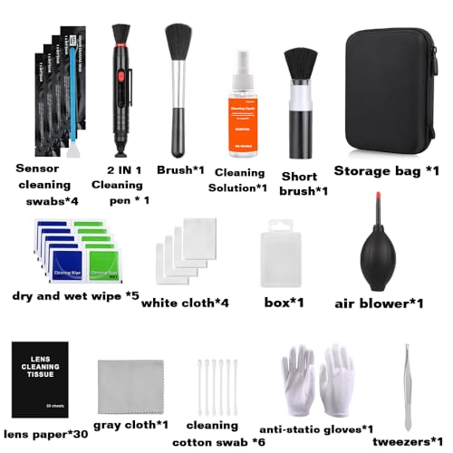 产品描述详情: 专业相机镜头清洁套件包括:吹气*1,二合一清洁笔*1,刷子*1,美容刷*1,清洁布*5,镜头纸*20,清洁棒*4,洗涤剂*1,干湿袋*5,镊子*1,收纳盒*1,棉签*5,使用说明书*1。 零划痕、高效清洁:极细的超细纤维可轻松清洁相机和镜头上的隐形灰尘、颗粒和污迹,不会留下划痕、条纹或痕迹。 无毒无酒精配方清洁剂套件在使用后不会留下任何划痕、条纹或痕迹。 更换清洁套件可以有效、安全地清洁相机和镜头上的污垢。 2合1镜头刷、清洁刷、携带方便、使用:配件全部装在黑色收纳盒中。 当您需要使用时,打开收纳盒,选择您需要的工具,非常简单方便。 【火箭吹气球】通过空气吹出镜头或相机传感器上的污垢和灰尘,空气吹走,造型独特。