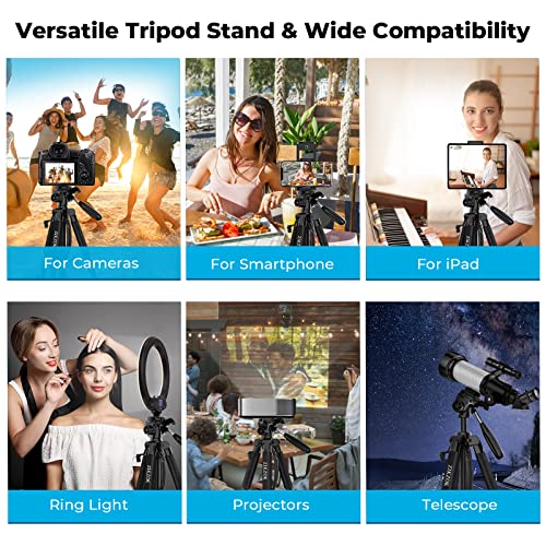 【Tripod for All Camera and Phone】With standard 1/4″ screw mount, our versatile tripod is perfect for all cameras, including DSLRs and compacts, such as Nikon, Canon, Fujifilm, and more. It’s also compatible with various phones, featuring a 360° mount for iPhones and Androids from 2.2″ to 7.5″, even for iPad Air, and more. With added quick release plates and a wireless remote, capturing stunning photos and videos is a breeze.