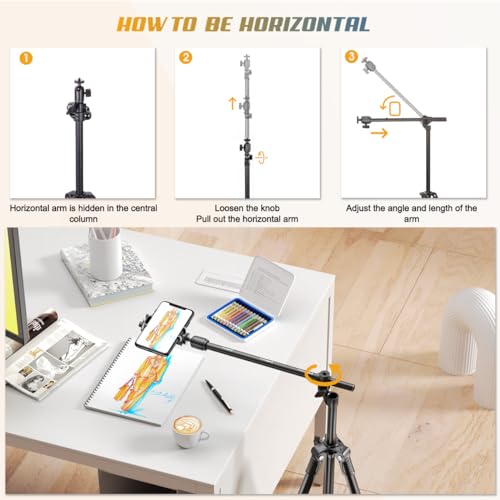 Phone Tripod, Lusweimi 67-inch Horizontal Tripod Stand with 360° Adjustable Ball Head and Wireless Remote for Camera/iPhone/Webcam, Tripod for Video Recording with Extended Arm/Clip Mount/Carry Bag