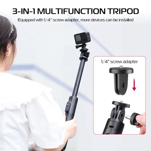 Multifunctional 3-in-1 Tripod: A retractable tripod that can be used as a mobile phone, selfie stick and camera stand. This tripod for iPhone can quickly switch between tabletop tripod and selfie stick mode. Built-in foldable long legs and non-slip foot pads make the base larger and more stable.